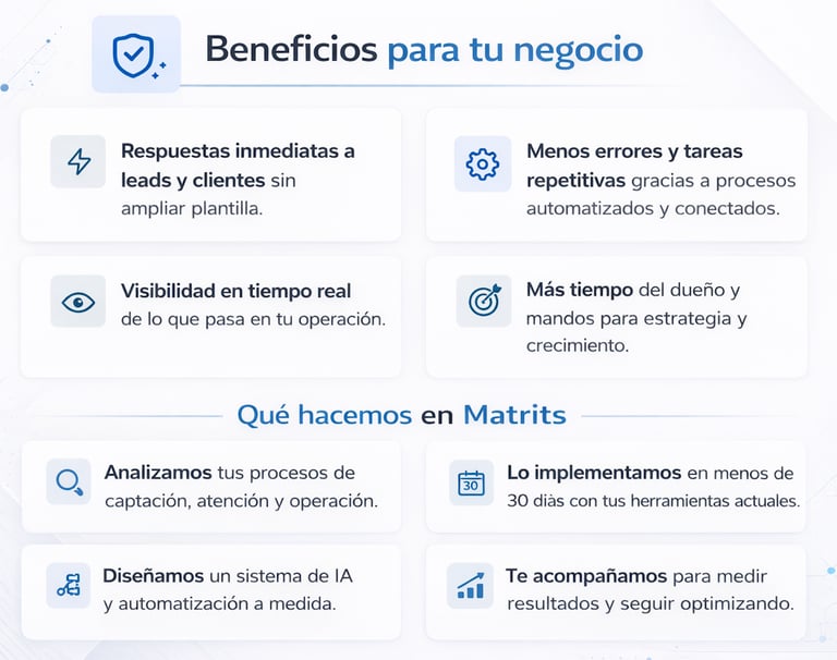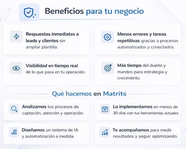 En Matrits conectamos tus sistemas y creamos flujos de IA que responden al instante, automatizan tareas repetitivas y aseguran que cada lead recibe el seguimiento que merece.